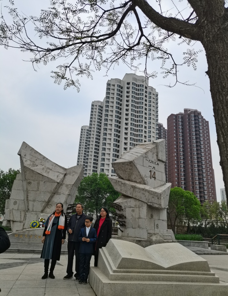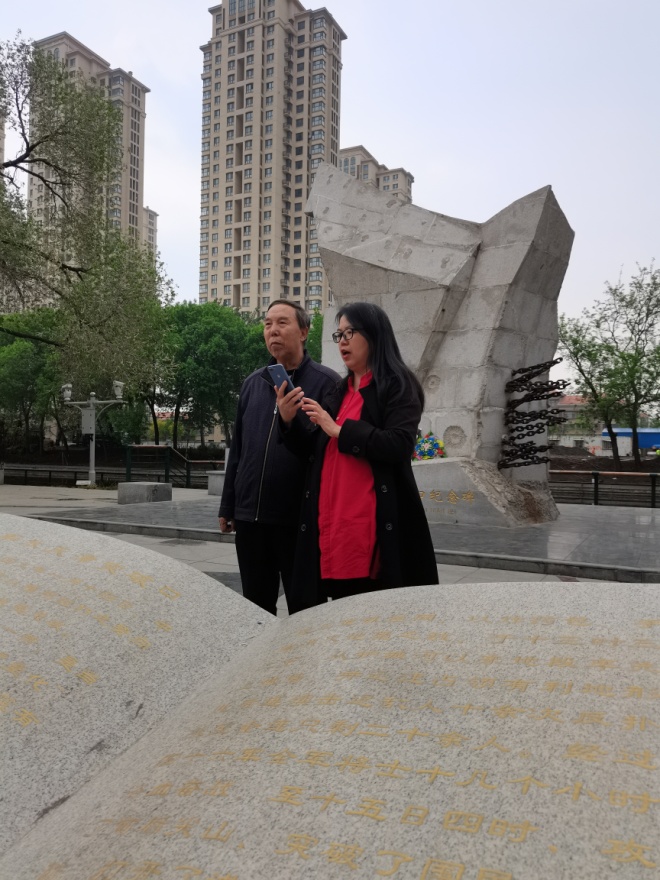 确定好了录制时间、地点,4月24日早上,我们一家六口兵分三路赶赴录制现场——河西区郁江道39号,到了录制地才知道就在路边进行,这里有个纪念碑,是解放天津突破口纪念碑,碑后是一条护城河。因提前一个小时到达,我们仔细观看了这座纪念碑,知道了中国人民解放军东北野战军第46军为解放天津在此处与国民党军进行了一场激烈战斗,两千余名将士负伤,419人牺牲,当时鲜血染红了城垣河床……如今,这里一片宁静祥和,鲜花盛开,树木葱茏,附近的居民在这里悠闲散步,孩子们在这里玩耍,庄严肃穆的纪念碑默默无语地高耸着,怀念着英魂,也护卫着和平。我们看到纪念碑下有市民自发送来的鲜花、花环,还遇到两位年过半百的男子在此祭奠烈士。通过交谈,我们得知这两位男子父辈都是军人,而且都参加了解放天津的战役,一位是第46军409团(纪念碑上碑文有记载)团长的后人,现住天津;一位是409团突击营二连战士的后人,特意从沈阳赶来,就是想给牺牲在此的父辈战友们献上鲜花与敬意。在纪念碑前,两位军人后代还绘声绘色地给孩子们讲起那场激烈的战斗,我的小侄子听得聚精会神,脸上写满崇敬之情,我想这堂现场课比他在课本里读到的战斗要生动具体得多,也会影响他的人生观,我们一行人和两位军人之后一起给长眠于此的英烈们鞠躬默哀。