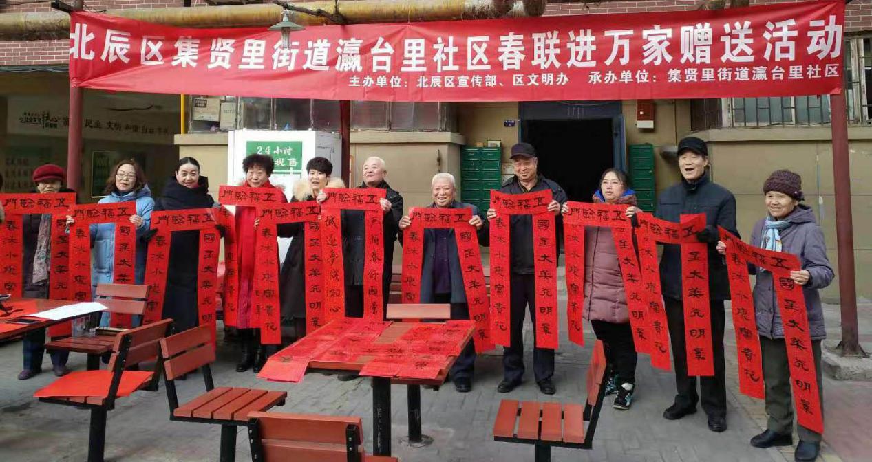 2020年1月19日,春联进万家赠送活动在集贤里街瀛台里社区举行,是为天津市楹联学会举办的“春联进万家公益活动”的组成部分。北辰区诗词楹联学会会长杨光祥现场讲解了对联与春联的区别、春联上下联的辨识和贴法等基础知识,北辰区诗词楹联学会副会长刘宝起、瀛台里社区居委会主任黄海燕、退休老干部赵义文、区文联《北斗星》编辑陈兴顺等参加了60副春联赠送活动,大学生刘佳欣当场书写并发放大红福字20个。