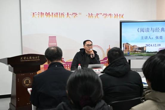 12 月 19 日下午,应天津外国语大学之邀,天津市作家协会副主席、文学院院长张楚前往该校滨海校区 “一站式”学生社区服务中心,开展了一场题为“阅读与经典”的专场讲座。此次活动由天津外国语大学国际传媒学院院长马兰州主持,吸引了众多热爱文学的师生踊跃参与,现场气氛热烈。
