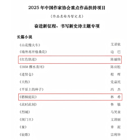 5月30日,中国作家协会重点作品扶持办公室发布2025年中国作家协会重点作品扶持项目名单,天津作家林希的长篇小说《梧桐庭院》选题、陈丽伟的长篇小说《红色轨道》选题入选。